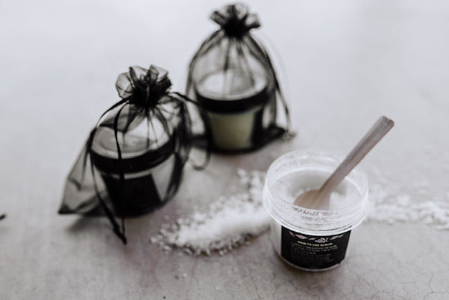 Our scrubs are made with 5 ingredients: Infused Epson Salt, Coconut Oil, Shea Butter, Pink Himalayan Salt and Essential Oils.